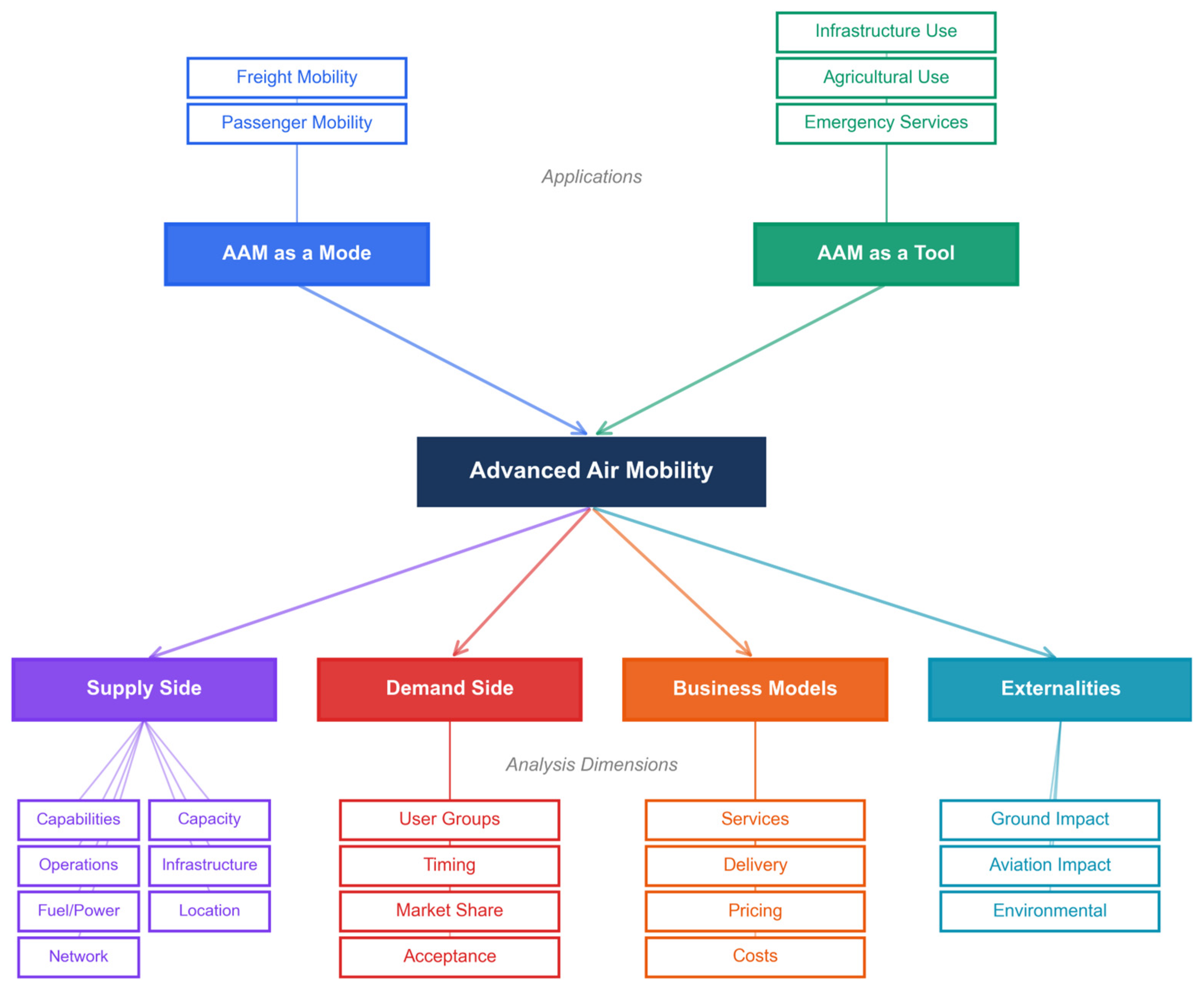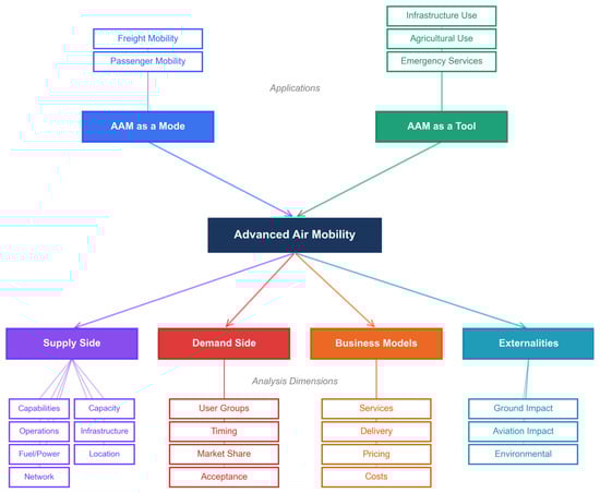 This multi-dimensional approach reflects the reality that AAM represents not merely a new transportation option, but a complex sociotechnical system requiring the coordinated consideration of technological capabilities, market dynamics, infrastructure investments, regulatory frameworks, and societal impacts. The study’s purpose is, therefore, to provide decision-makers with a holistic assessment that identifies the most viable pathways for AAM development while highlighting critical barriers and policy needs that must be addressed for successful implementation. By examining these dimensions comprehensively, this work establishes a foundation for informed policy decisions regarding whether and how to pursue AAM development in the state.