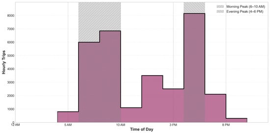 Finally, each selected trip’s original reported departure time was preserved without modification or smoothing, and weighted trip counts were aggregated into one-hour bins spanning the 24 h day, with each bin representing the sum of expansion-weighted trips departing during that time window. Peak usage concentrates on two windows, 6:00–10:00 a.m. and 4:00–6:00 p.m., with demand volumes reaching twice (or more) the levels observed during off-peak hours. These patterns suggest air taxi networks will face concentrated demand during morning and evening peaks, with extended periods of minimal activity in between (Figure 5).