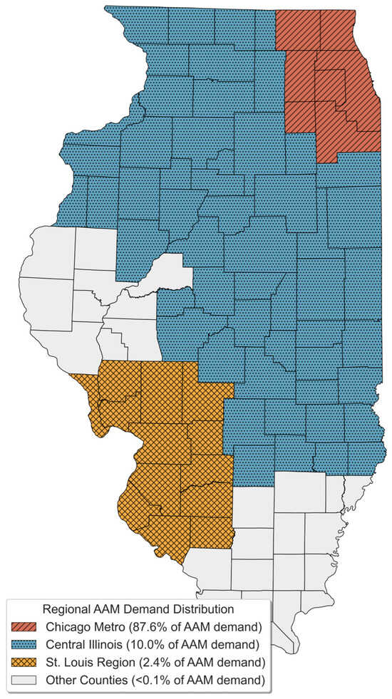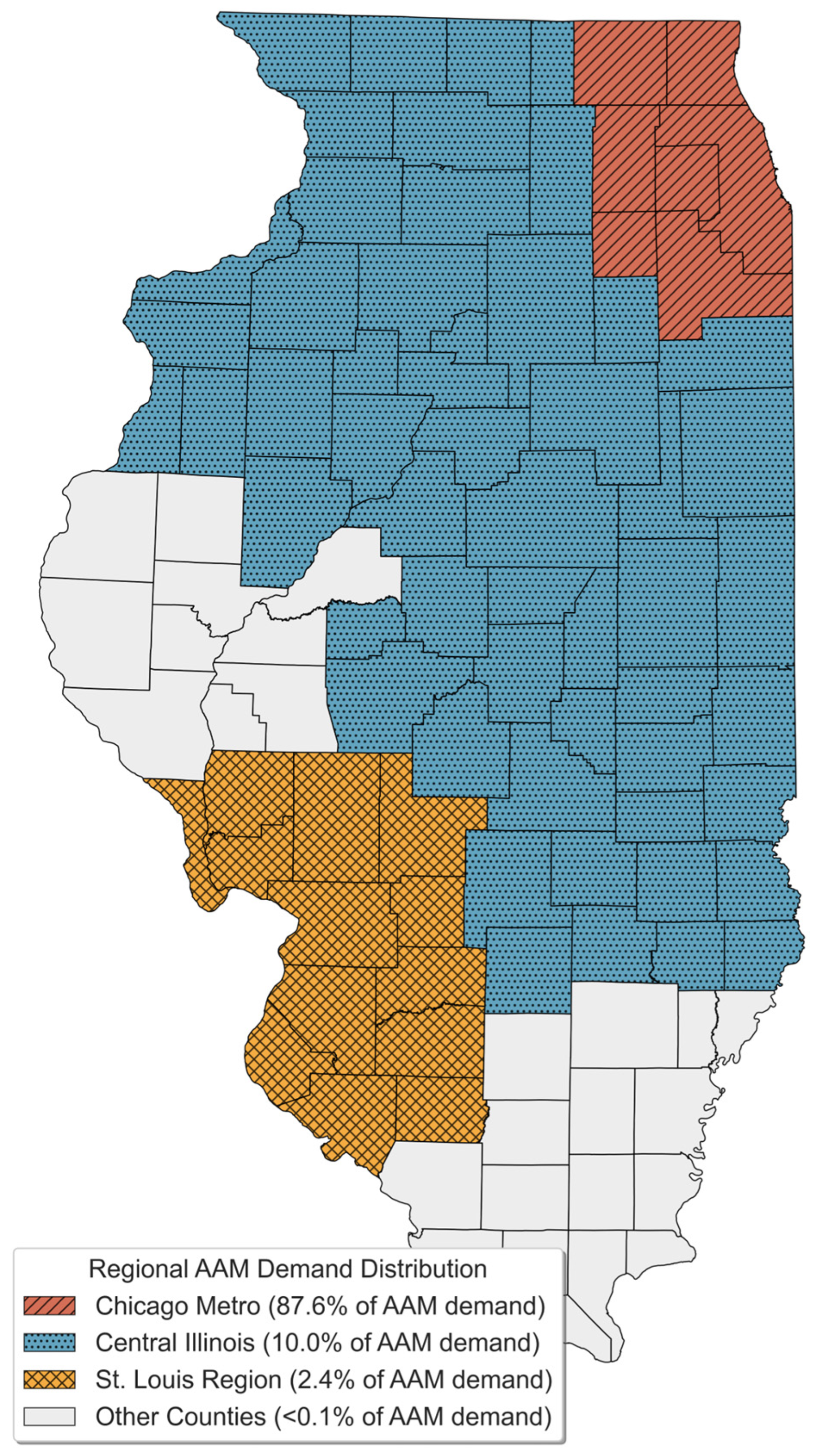 Regional distribution of potential air taxi usage across Illinois shows a marked geographic concentration. The Chicago region accounts for 87.6% of projected daily air taxi operations, compared to 68.5% of total travel statewide. This concentration reflects both Chicago’s substantial trip volume and the prevalent congestion-related delays throughout the metropolitan area. Beyond Chicago, central Illinois represents the primary secondary market (10% of projected air taxi trips versus 24.9% of all statewide trips), with the St. Louis region showing more limited activity (2.4% of projected air taxi trips versus 6.6% of total trips). Figure 6 visualizes the geographic distribution of projected AAM demand across Illinois counties, with color coding and hatch patterns distinguishing the three primary demand regions and illustrating the marked concentration in the Chicago metropolitan area.