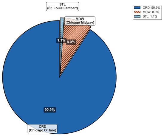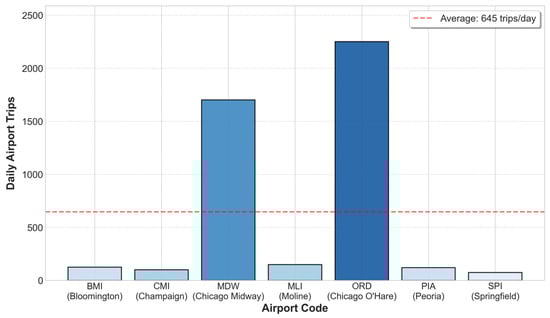 Demand concentration emerges at two facilities: Chicago O’Hare (ORD) and Chicago Midway (MDW), which handle the majority of commercial passenger traffic at Illinois airports. Figure 7 displays the projected air taxi demand at airports exceeding ten trips daily. The two major Chicago airports could generate up to 2000 daily passengers, while other Illinois facilities may serve only several dozen passengers per day.