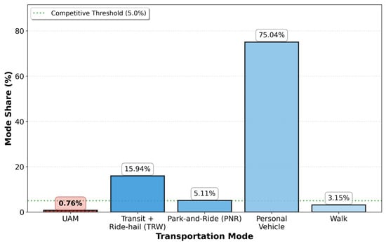 where the utility incorporates travel time savings ( Δ t i ), cost difference between ground and air ( Δ c i ), travel time coefficient ( β t i m e ), cost coefficient ( β c o s t ), and air taxi alternative specific constant ( A S C a i r ), which were based on parameters estimated by the Chicago Metropolitan Agency for Planning (based on model coefficients described in [19]). While these coefficients were not estimated specifically for air mobility services, they represent behavioral tradeoffs between time and cost that are expected to remain consistent across modes. The application of these coefficients to UAM represents an approximation, given the absence of empirical UAM choice data, though it likely understates the additional barriers to adoption associated with novel technology concerns, safety perceptions, and unfamiliarity. UAM-specific characteristics were incorporated through the alternative specific constant and through the appropriate specification of UAM service attributes (travel time, cost, and access requirements) that reflect the unique operational profile of air taxi services. This probability calculation was performed independently for each of the qualifying trips, generating a trip-specific likelihood of air taxi selection ranging from near-zero (for trips where air taxi offers minimal time savings at substantial cost premium) to near-unity (for extended trips where time savings are significant and willingness-to-pay is satisfied).