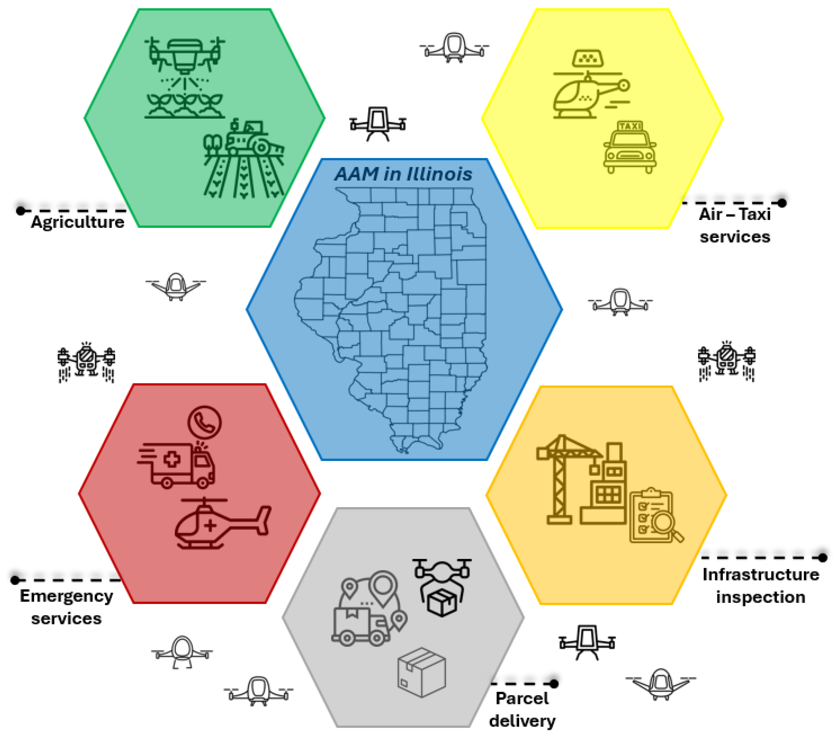 Multiple AAM applications and use cases have been identified for use in the State of Illinois (Figure 3). In agricultural contexts, low-altitude UAV operations promise to improve farm management through crop health monitoring, livestock observation, irrigation systems oversight, and more precise pesticide distribution, thereby lowering operational expenses and boosting productivity. UAV-based parcel delivery could optimize logistics operations for packages under 5–10 pounds, though current battery technology limits payload capacity and the Federal Aviation Administration (FAA) regulations restrict operations during precipitation, high winds (>25 mph), and low visibility conditions, which are common during Illinois winters. Emergency AAM applications are positioned to improve healthcare access through expedited medical transportation, offering particular advantages during severe weather events and flooding scenarios, with potential expansions encompassing automated patient transport and organ transplant conveyance. UAVs are additionally anticipated for infrastructure inspection applications, offering risk reduction, temporal efficiency, and cost advantages compared to conventional inspection approaches.