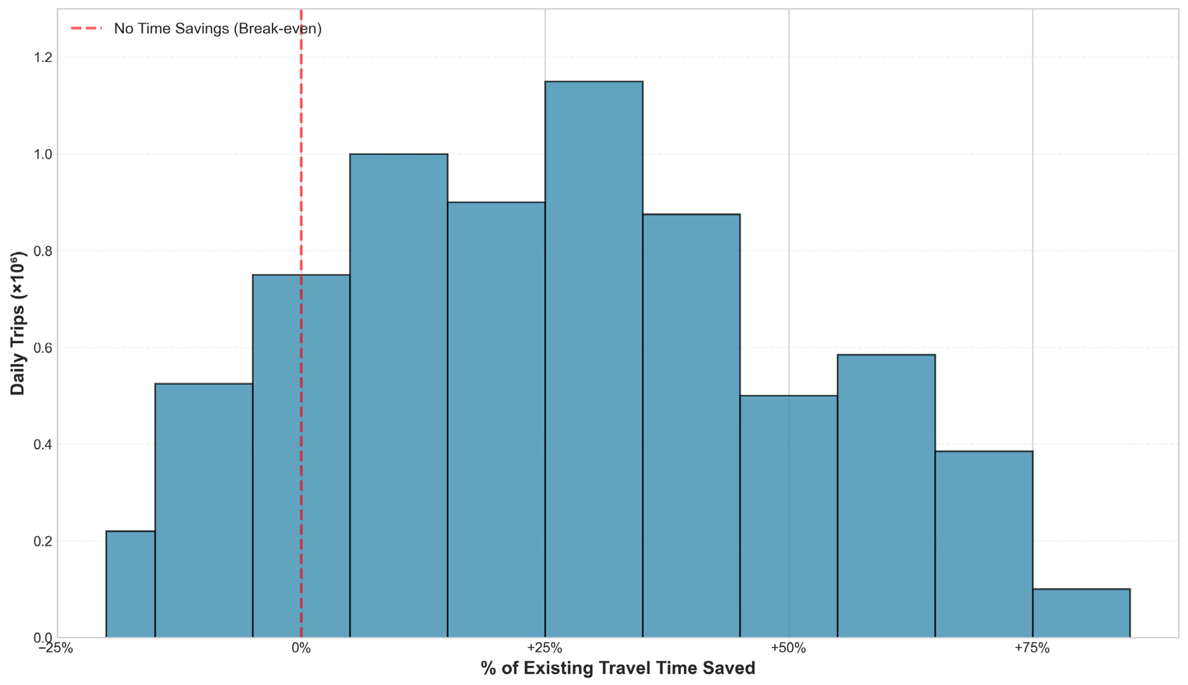 The analysis examined ground transportation-based journeys exceeding 30 min, considering that threshold for competitive air taxi viability reasons (based on [16]). Within this segment, close to 90% of trips demonstrated potential travel time reductions when using air taxis. Median time savings for such journeys reached 25%, translating to 15 min or less for most trips, generally comparable to surface transportation durations. Additionally, a quarter of long-distance trips achieved at least a 50% travel time reduction, identifying a market segment where air taxi operations offer substantial time savings and enhanced user appeal. For time valuation, $20.60/h was applied (adjusted to 2025 U.S. dollars from the baseline values in [22,23]), and it was also used to evaluate potential UAM users’ willingness-to-pay, combined with per-trip time savings.