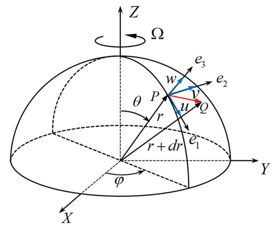 Figure 1, the center of the hemispherical shell is selected as the origin of the coordinate system, with the corresponding coordinate parameters denoted as r, θ, φ, where θ ∈ [0, π/2] and φ ∈ [0, 2π]. The displacement components along the three directions are denoted as u, v, w.