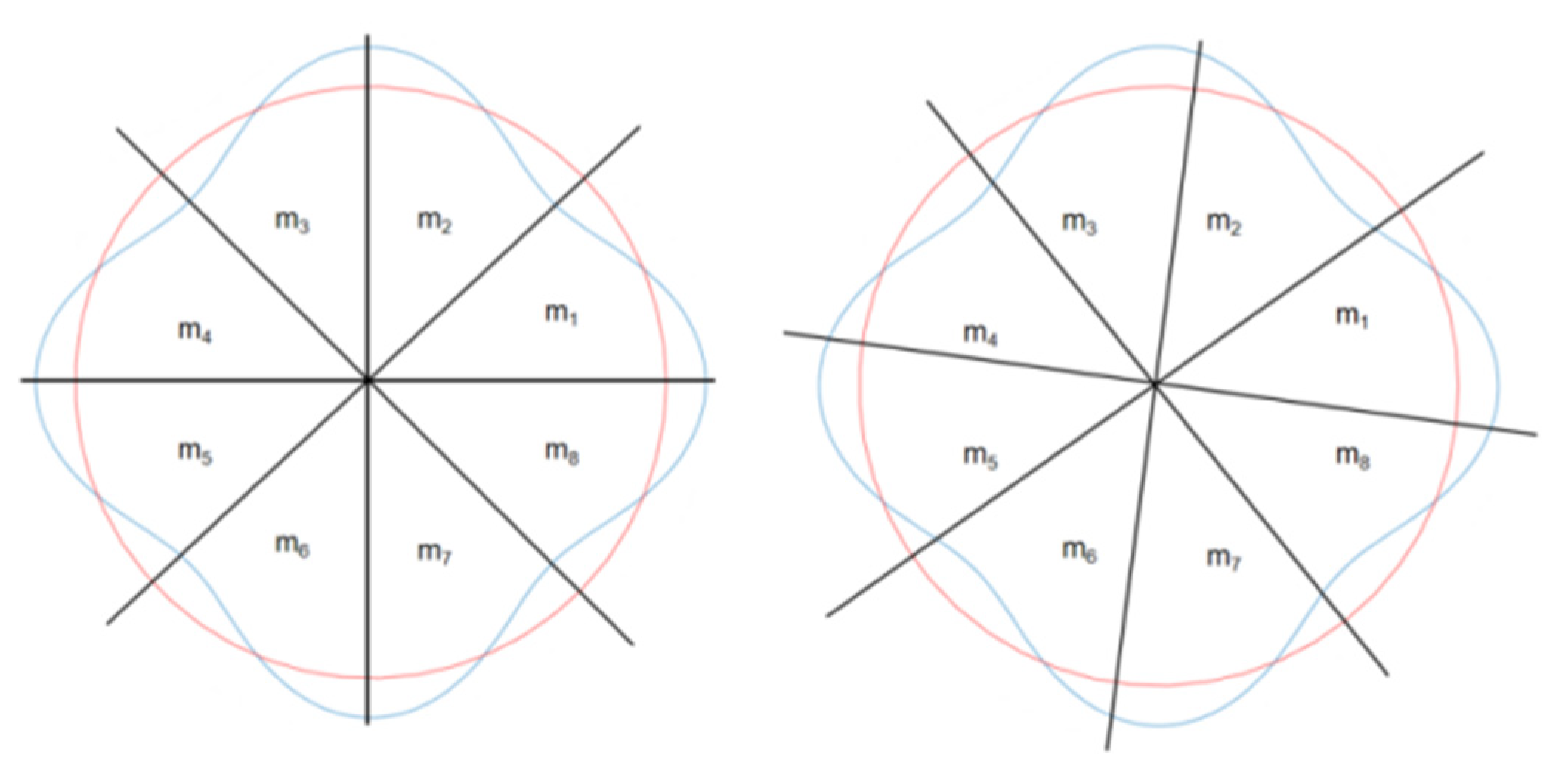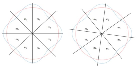 Figure 3, the red area represents the circumference of the hemispherical resonator, while the blue distribution corresponds to the fourth harmonic of its mass inhomogeneity. To nullify the influence of the fourth harmonic mass inhomogeneity during meshing, the proposed concept dictates that the hemispherical shell be divided into 4N (where N = 1, 2, 3, …) sectors. A 90° rotation of these sectors results in a configuration that is mass-equivalent to the original. Similarly, to suppress the first, second, and third harmonics of mass inhomogeneity, the resonator should be partitioned into N, 2N, and 3N uniform sectors, respectively. By ensuring mesh uniformity within each of these sectors, the overall mass distribution is rendered uniform, building upon the foundation of consistent total mass for the major sector divisions.