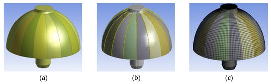 Following this, the processed model was imported into the ANSYS Mechanical module for meshing. The MultiZone method was applied to the hemispherical resonator for initial mesh generation. All 17 bodies were selected as the meshing scope, with the mapped mesh type specified as hexahedral. Multiple Edge Sizing constraints were defined to control the mesh within each 22.5° sector. The first Edge Sizing constraint was applied to the lip circumference arc and the arc at the intersection of the shell’s transition fillet and the support stem, imposing 8 divisions per 22.5° sector. A second constraint was applied to the arcs along the generatrix of the hemispherical shell, specifying 30 divisions per arc. A third constraint governed the arcs along the generatrix of the transition fillet between shell segments, with 6 divisions on the inner surface and 3 divisions on the outer surface of each arc, as shown in
