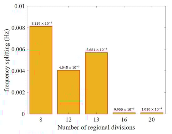 Figure 5 reveals that simulation accuracy generally improves with an increasing number of partitions. Notably, when the number of partitions reaches 16, the simulated frequency splitting achieves millihertz-level accuracy. However, no further improvement in accuracy is observed when the number of partitions is increased to 20. This suggests that the mesh uniformity of the shell is already near-optimal at 16 partitions, and beyond this point, the mesh quality of the support stem becomes the limiting factor for accuracy.