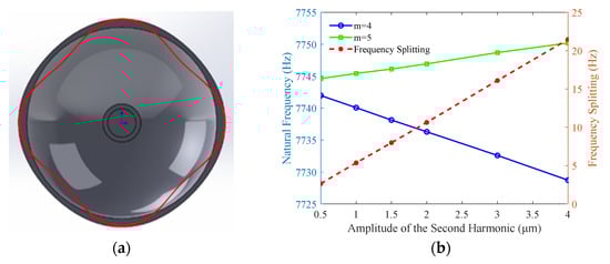 h4 is obtained as shown in Equation (12), that is, when the amplitude of the fourth harmonic of the uneven circumferential thickness error is 1 μm, the frequency splitting of the hemispherical resonator is 3.873 Hz.