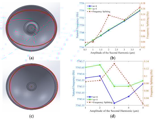 Figure 7a–d depict the variation in the natural frequency and frequency splitting of the operational vibration mode with respect to the amplitudes of the first and second harmonic thickness errors. The analysis indicates that a fourth harmonic thickness error with an amplitude of 2 μm can induce frequency splitting on the order of 10 Hz. In contrast, the frequency splitting caused by first and second harmonic errors of the same amplitude remains at a level of 0.2 Hz or lower. This conclusively demonstrates that the fourth harmonic of the circumferential thickness error is the dominant factor affecting frequency splitting. Consequently, during the resonator’s machining process, paramount importance must be placed on controlling the fourth harmonic circumferential thickness distribution, striving to suppress its amplitude to the nanometer level.