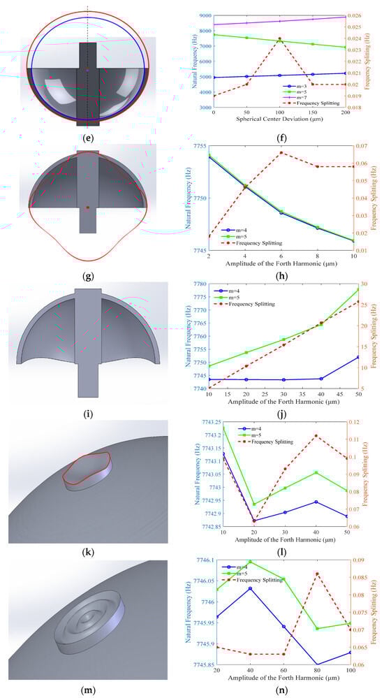 Figure 7f. As the offset increases, the natural frequency of the m = 4 working mode decreases, facilitating its excitation. Conversely, the natural frequency of the m = 3 mode increases, progressively narrowing its separation from the working frequency and thus posing a risk of interference. Notably, the spherical center offset has a negligible impact on frequency splitting itself, which remains around 0.02 Hz without an observable trend. This phenomenon can be leveraged to design resonators with intentionally tailored thickness profiles, effectively reducing the excitation frequency while maintaining satisfactory vibrational characteristics.