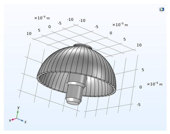 A 3D error model featuring a fourth harmonic circumferential thickness variation was created in SolidWorks. Specifically, the inner surface of the resonator’s hemispherical shell was defined as an ideal hemisphere with a radius of 10 mm. The outer surface, in contrast, was modeled as a non-ideal spherical surface, with its contour defined by Equation (13). This approach characterizes the fourth harmonic circumferential thickness distribution error through the relative thickness relationship between the ideal inner and non-ideal outer surfaces. The established error model is shown in