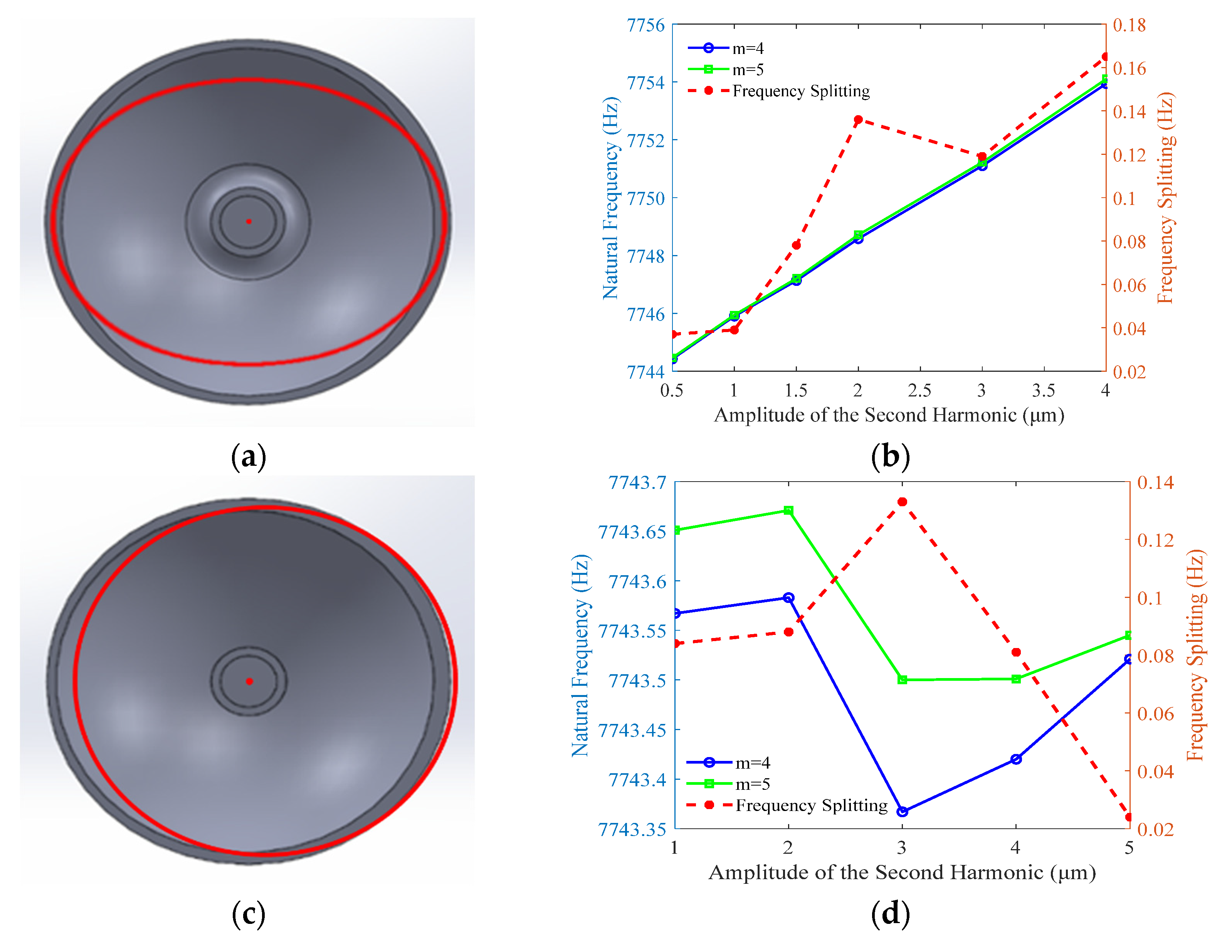 A further analysis of the results demonstrates a linear correlation between the frequency splitting of the resonator and the amplitude of the fourth harmonic circumferential thickness variation. Quantitatively, a fourth harmonic thickness error amplitude of 1 μm induces a frequency splitting of approximately 5.38 Hz.
