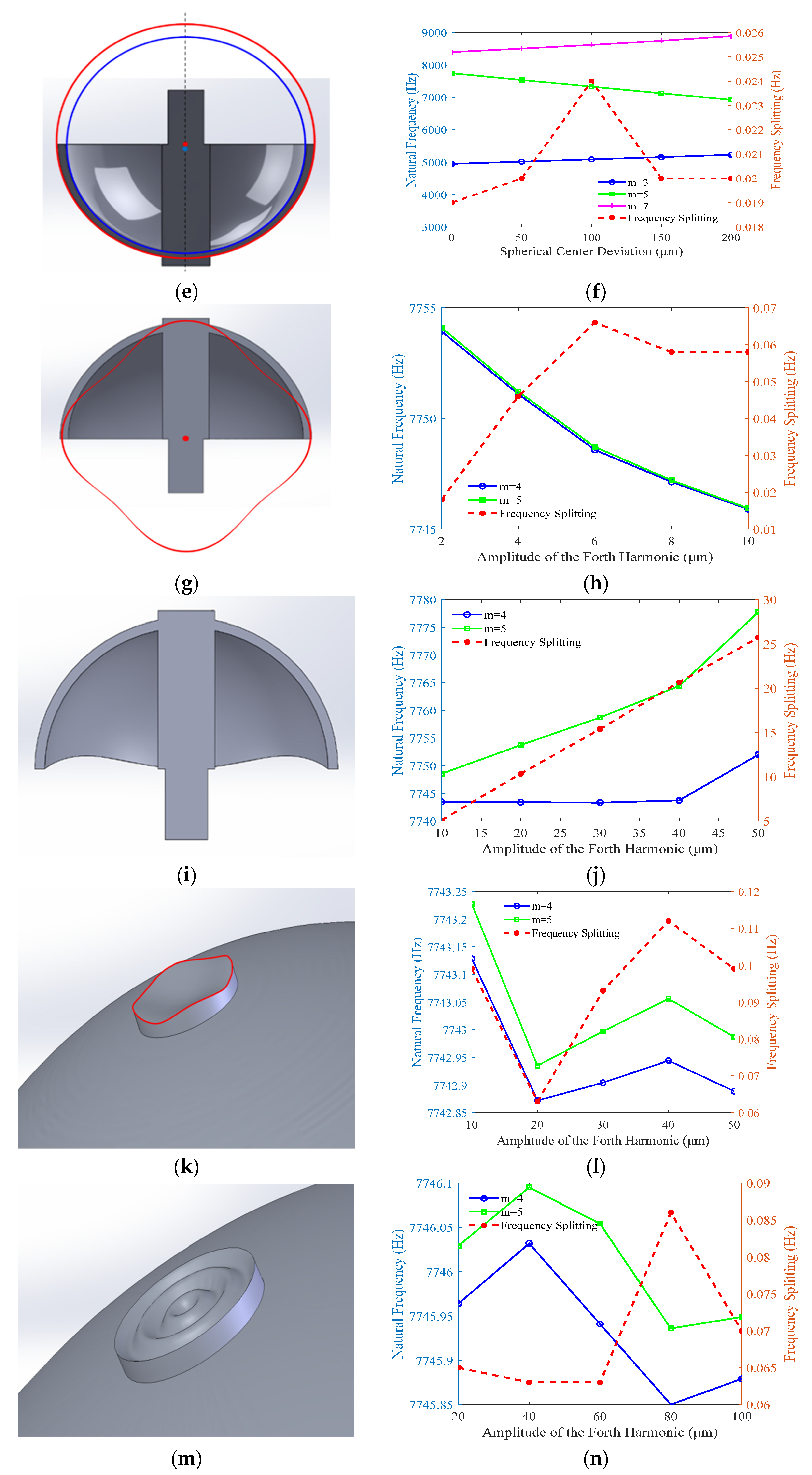 Figure 7e illustrates an error model featuring a vertical offset (0–200 μm) between the centers of the inner and outer spherical surfaces. The modal analysis, encompassing the m = 3, 4, and 5 modes, reveals the trends shown in