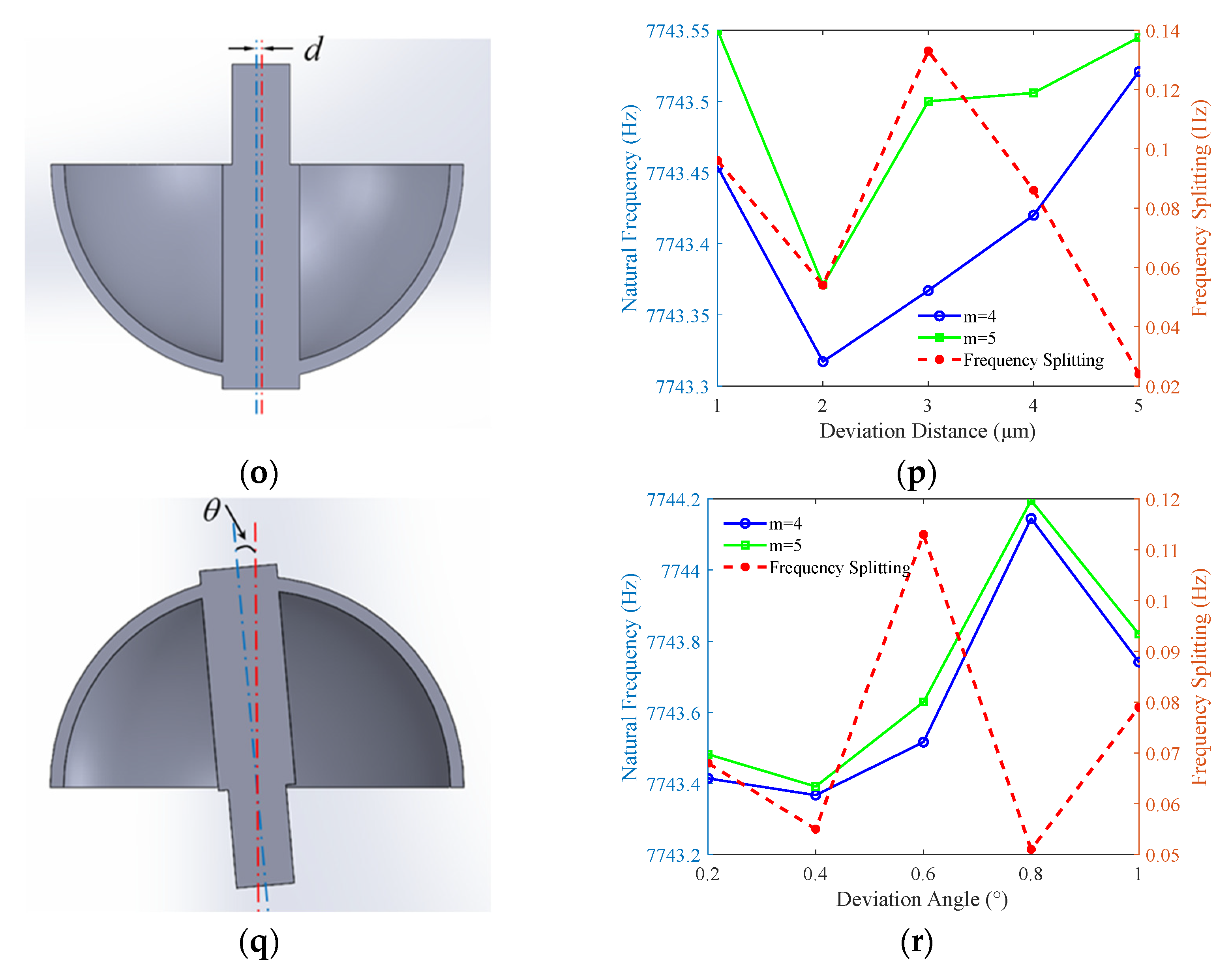 Figure 7p,r) show that both errors have only a minor effect on the natural frequency and frequency splitting of the working mode, with values fluctuating slightly and stabilizing. However, these errors shift the resonator’s center of mass, significantly impacting low-order modes (e.g., shell swing). This increases energy dissipation, shortens the vibration decay time, and is thus detrimental to operational performance.