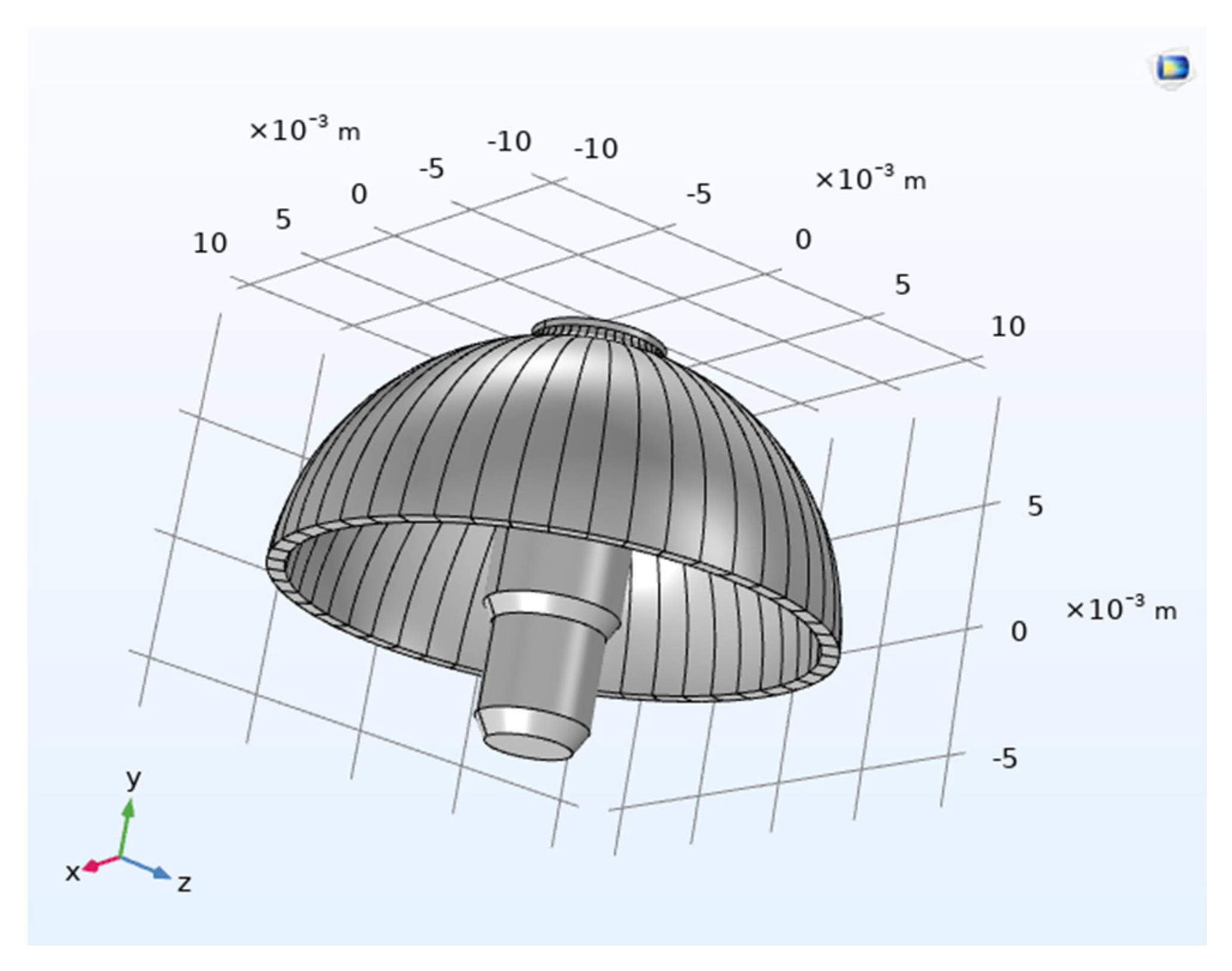 The hemispherical resonator model was created in SolidWorks. Utilizing the ‘Split’ and ‘Combine’ features, the hemispherical shell was partitioned into 16 equal segments, while the central support stem was treated as a single segment, resulting in a total of 17 distinct bodies.
