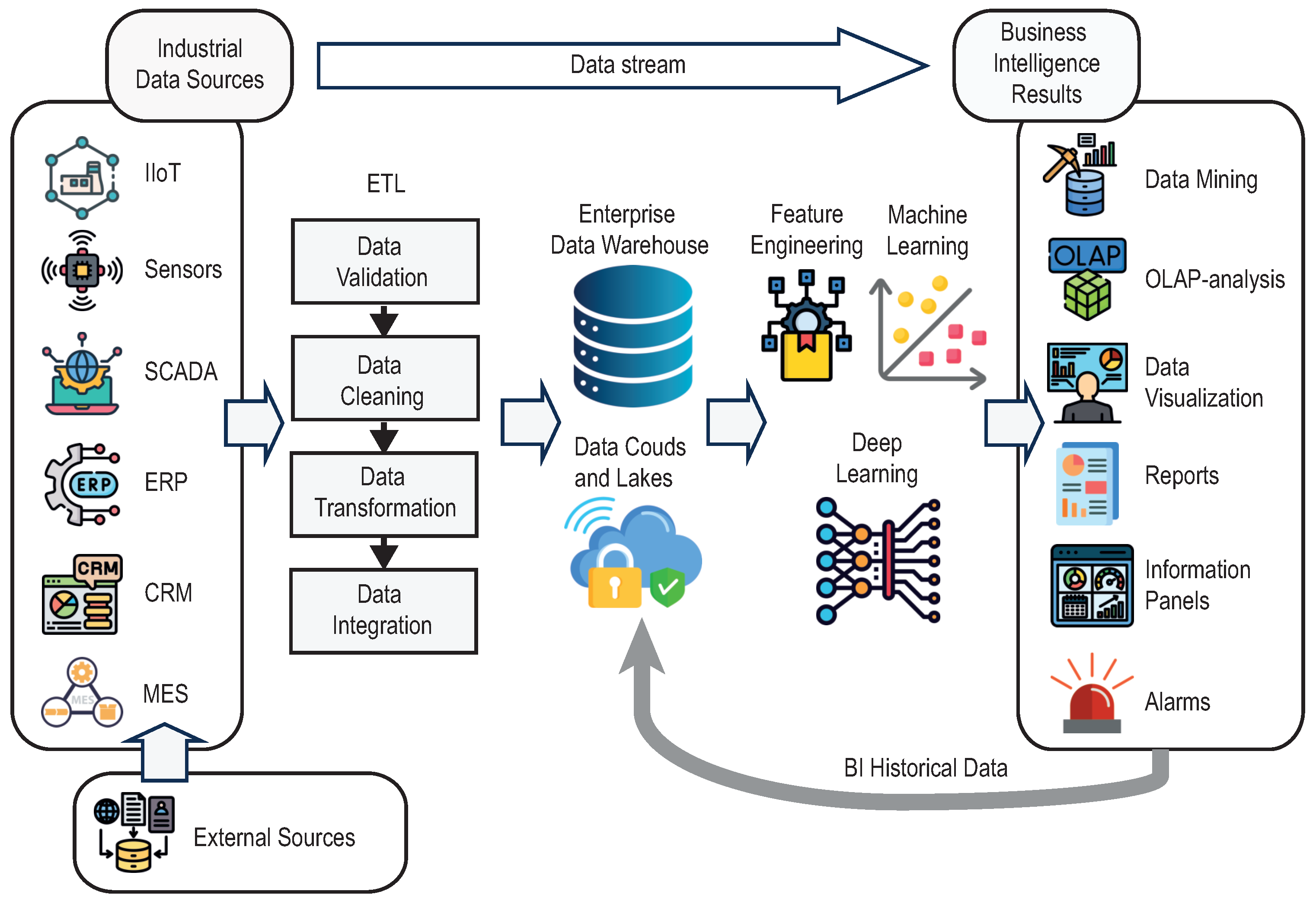 - Integration of data from different sources. Data can come from sensors, IIoT devices, ERP and SCADA systems, which requires them to be combined into a unified system [2]. For example, in a chemical plant, data from sensors that monitor pressure and temperature are integrated with data from an ERP system that manages raw material inventory. This allows the production process to be optimized and costs to be reduced.