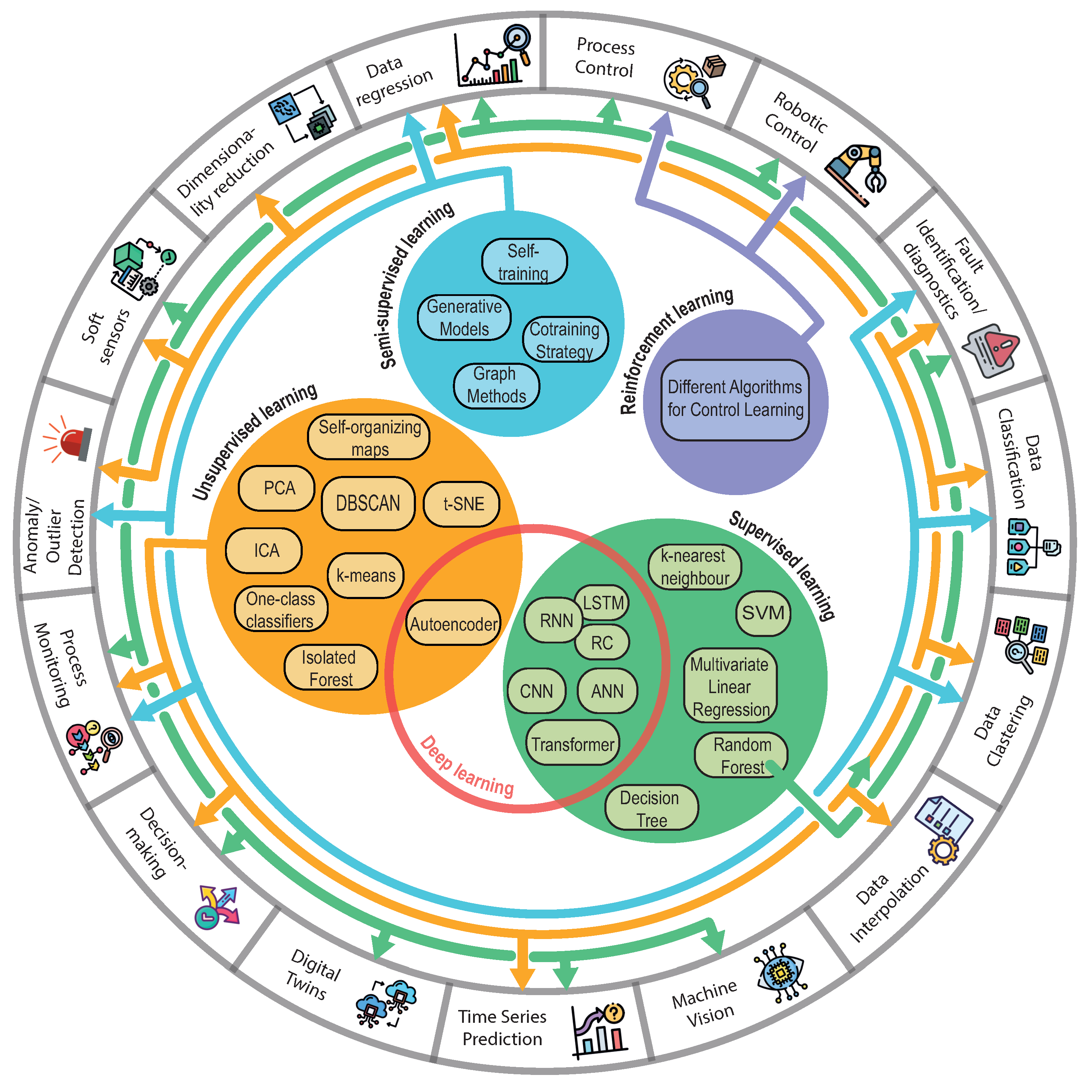 - Semi-supervised learning (SSL) is increasingly finding application in industrial data processing tasks when the cost of labeling data samples is expensive or time consuming [66]. The main difference between semi-supervised and fully supervised ML is that the latter can only be trained using fully labeled datasets, while the former uses both labeled and unlabeled data samples during training. For example, determining the type of faulty data samples detected is a difficult labor-intensive task for engineers. As a consequence, most faulty samples turn out to be unlabeled, but they still contain important process information. If these unlabeled samples can be put to good use, the efficiency of the fault classification system can be greatly improved. SSL methods modify or augment the supervised algorithm, the so-called base learner, to incorporate information from unlabeled examples. The labeled data are used to justify the predictions of the base learner and add structure (e.g., the number of existing classes and the main characteristics of each class) to the learning task. In this case, semi-supervised MLs using both labeled and unlabeled samples yield an improved fault classification model compared to a model that depends only on a small fraction of labeled data samples.