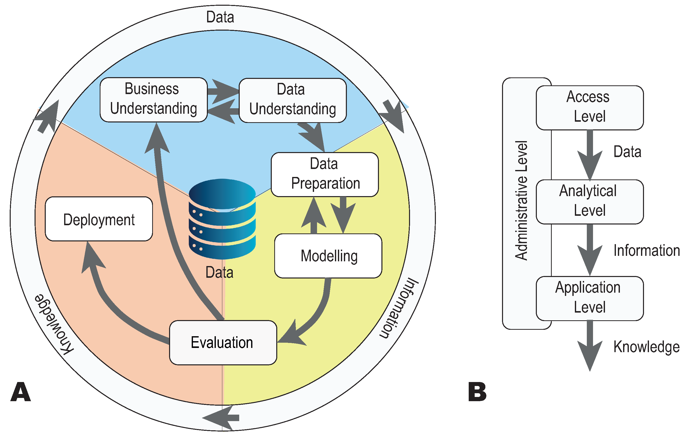 - Analytical level refers to the quality of data analysis and is primarily concerned with information. This corresponds to the second and third step of CRISP-DM (see Figure 4A) ‘Data Preparation’ and ‘Modeling’. In this step, data access needs the context of a special use case or problem definition. The context guides the processing steps using at least one special analysis method. The criteria presented in Table 2 assess the quality of the data analysis.