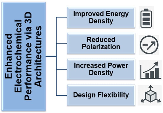 Importantly, the design-driven improvements facilitated by 3D printing are not limited to laboratory-scale prototypes but hold potential for scalable manufacturing []. The ability to digitally control architectures ensures reproducibility across multiple batches and allows for the adaptation of designs to different material systems with minimal modification of the printing process []. This digital versatility is critical for accelerating the translation of novel electrode concepts into practical devices. As such, the performance gains enabled by 3D architectures are not only scientifically significant but also strategically aligned with industrial requirements for high-throughput and application-specific energy storage solutions []. The conceptual illustration in Figure 2 summarizes how 3D-printed architectures can enhance electrochemical performance by enabling structural designs that optimize transport properties and stability.