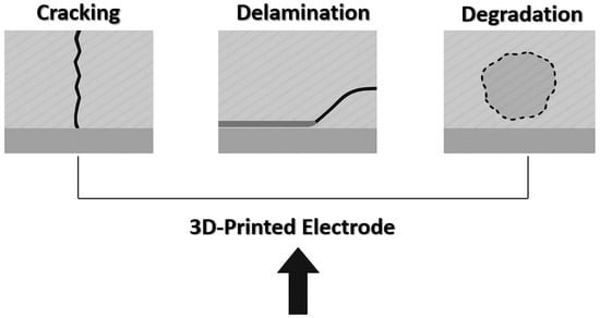 Beyond initial performance, the long-term durability of 3D-printed batteries remains largely underexplored compared to conventionally manufactured devices. Aging phenomena such as electrolyte decomposition, dendrite formation, and interfacial instability may be exacerbated by the non-equilibrium structures often produced by printing methods []. Furthermore, the lack of standardized protocols for testing printed batteries hampers the ability to compare results across laboratories and slows the identification of reliable design–performance correlations. Long-term cycling studies, accelerated aging tests, and systematic benchmarking are therefore indispensable to assess the practical feasibility of additive manufacturing in energy storage []. Without such reliability data, 3D-printed batteries are unlikely to gain traction in safety-critical applications such as electric vehicles, aerospace systems, or medical devices. To better illustrate the reliability challenges, Figure 5 summarizes the main degradation pathways and their impact on the long-term performance of 3D-printed batteries.