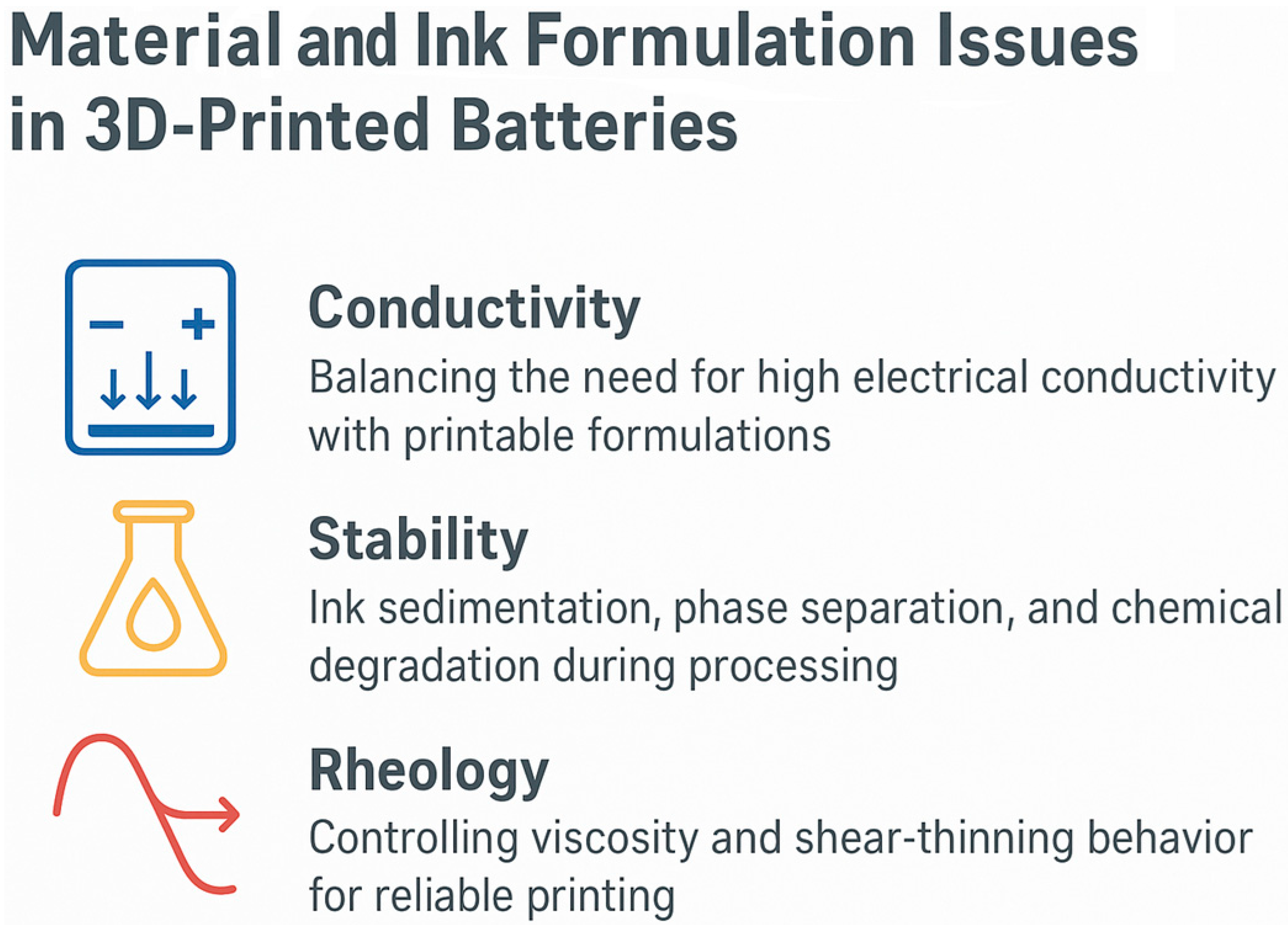 | Electrolytes and Separators [39,40,41,42,43,44,45,46,47,48,49,50,51,52,53,54,55,56] | Extrusion, inkjet printing, stereolithography (SLA) | Solid polymer electrolytes (e.g., PEO-based), ceramic-infused inks (LLZO, LATP), UV-curable resins for patterned separators | ~20–150 µm (electrolyte layers); ≤50 µm pore/alignment resolution in patterned separators | 25–50% increase in ionic conductivity; improved mechanical robustness; enhanced thermal and interfacial stability |