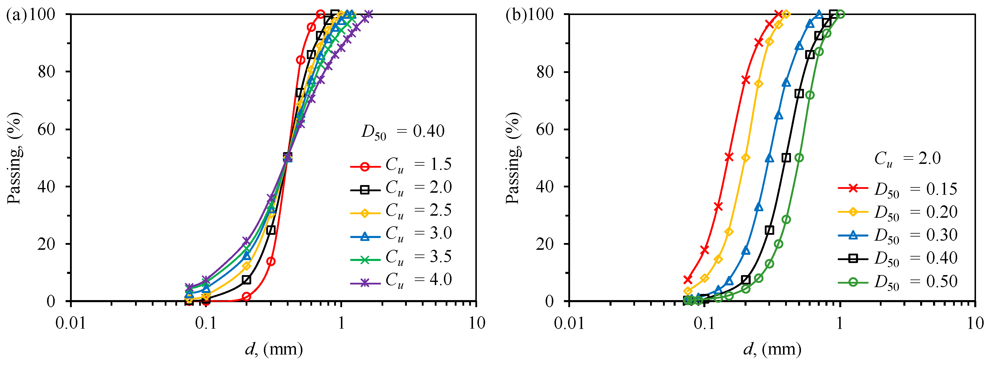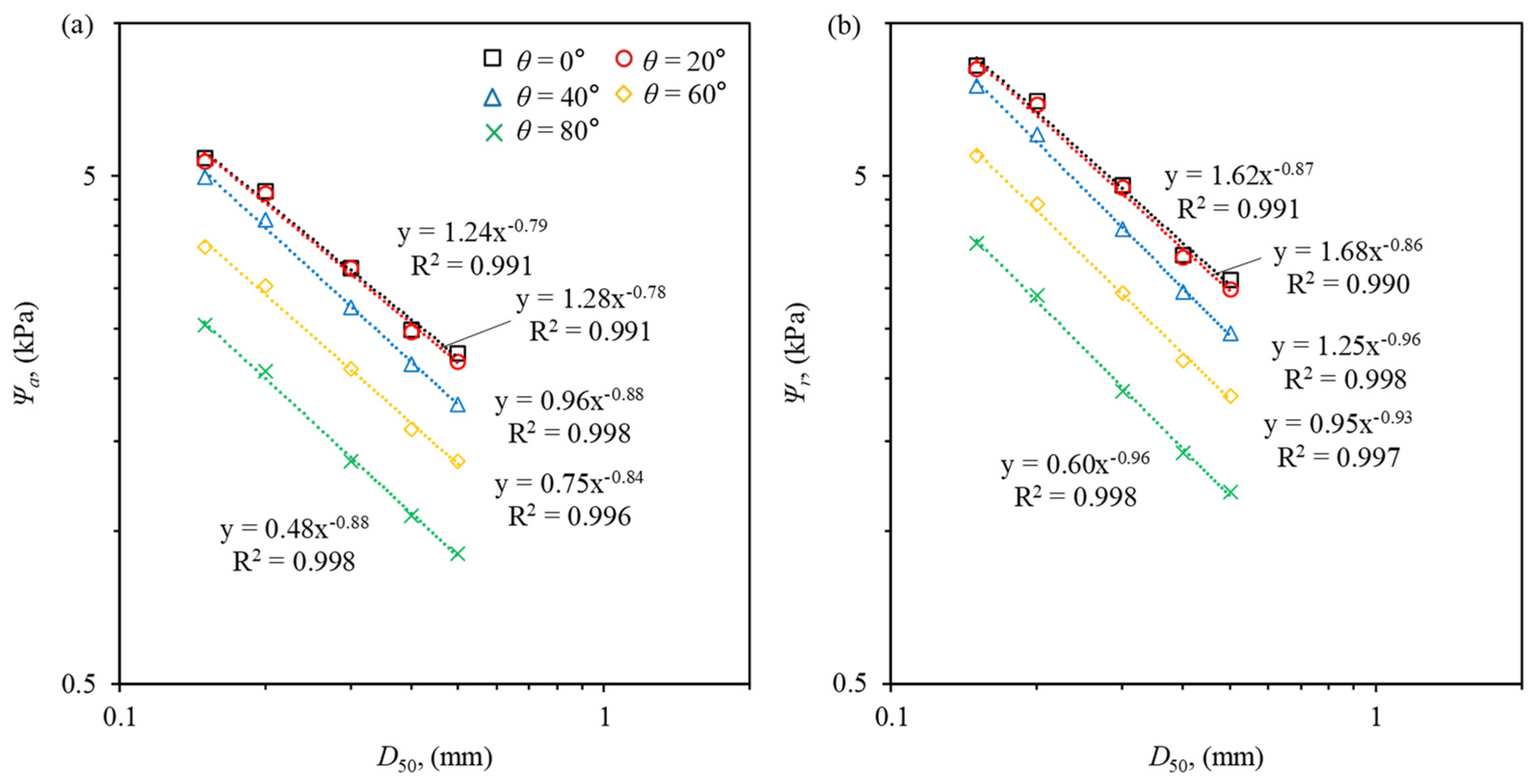 - Linear relationships were identified between SWCC variables ( and ) and factors such as , , and . In contrast, a power-law relationship was observed between SWCC variables and , demonstrating the nonlinear effects of grain size distribution on water retention behavior, particularly for finer particle sizes.