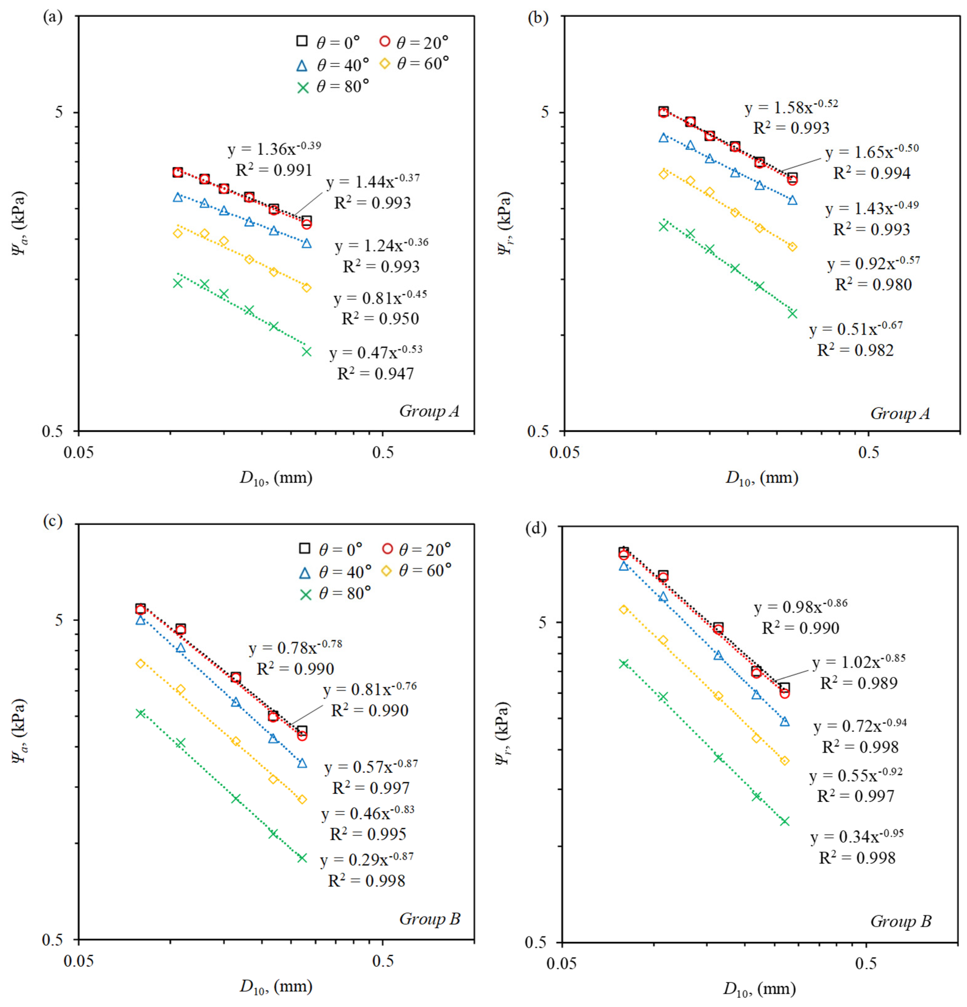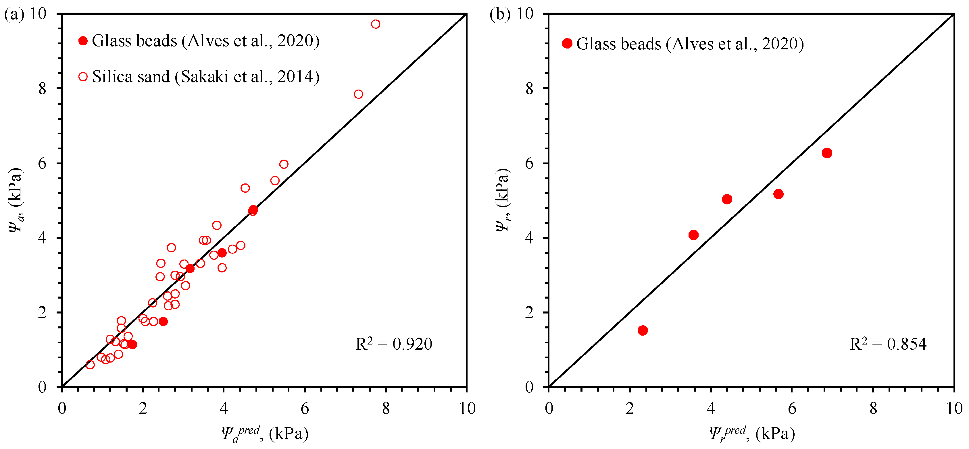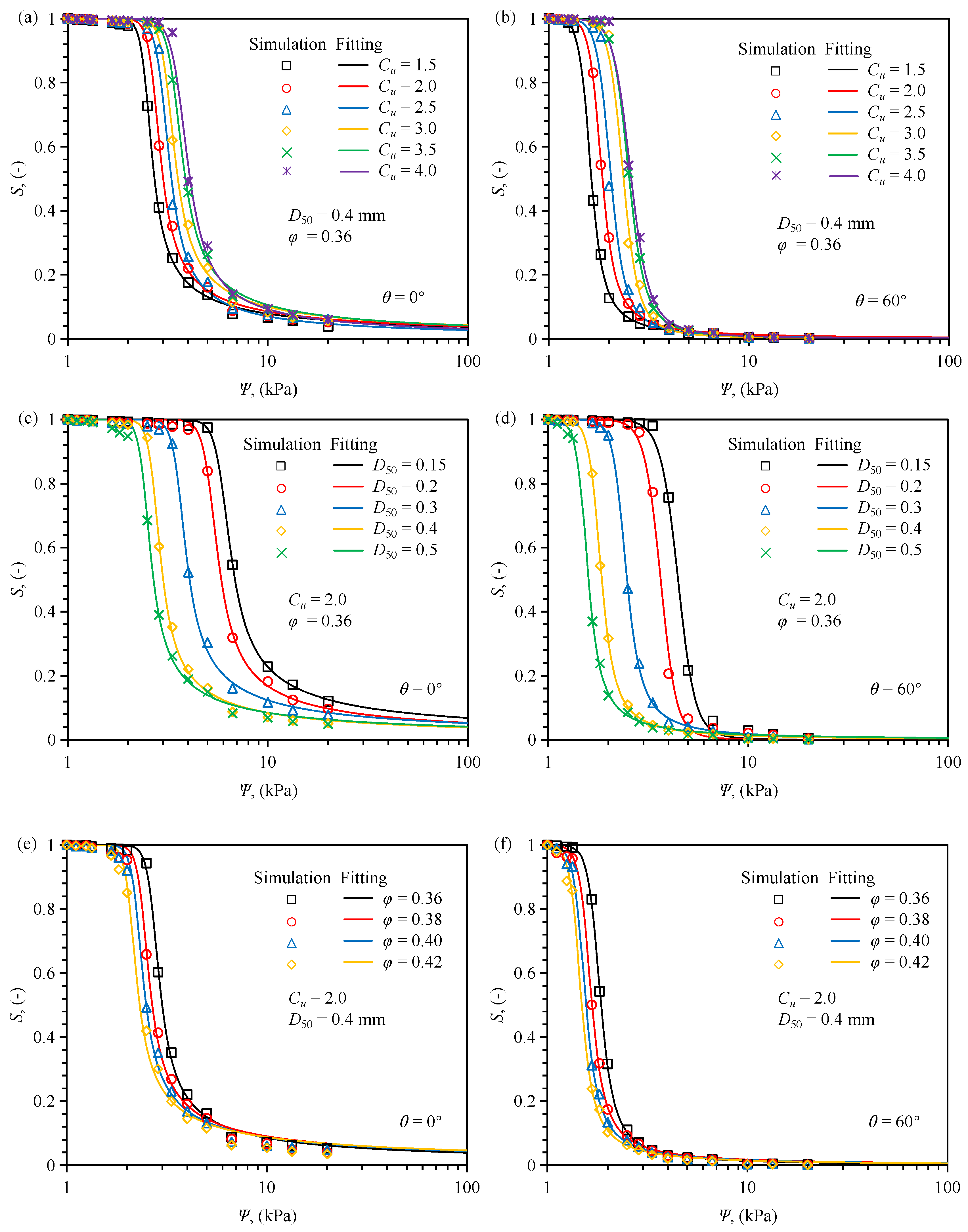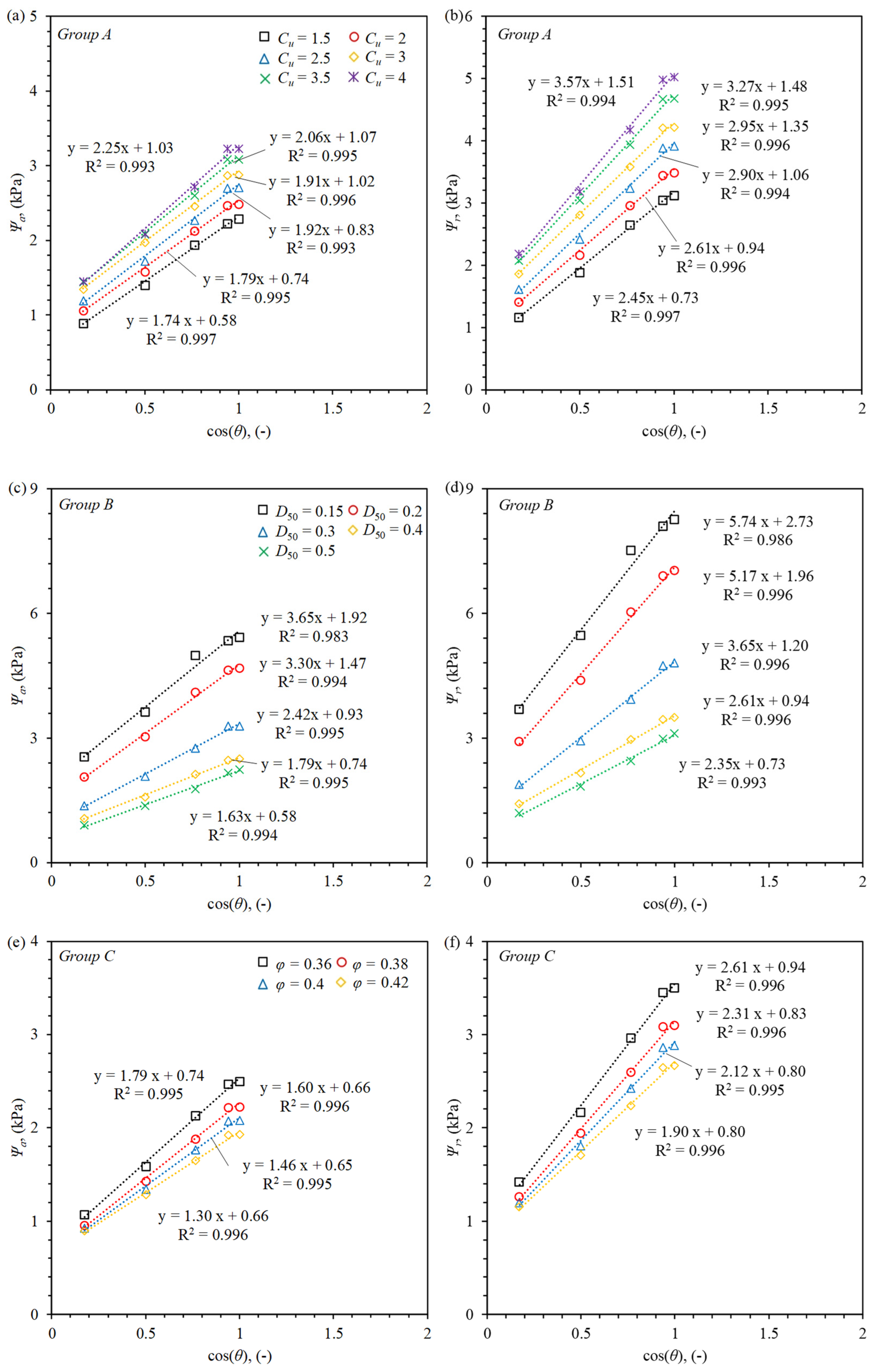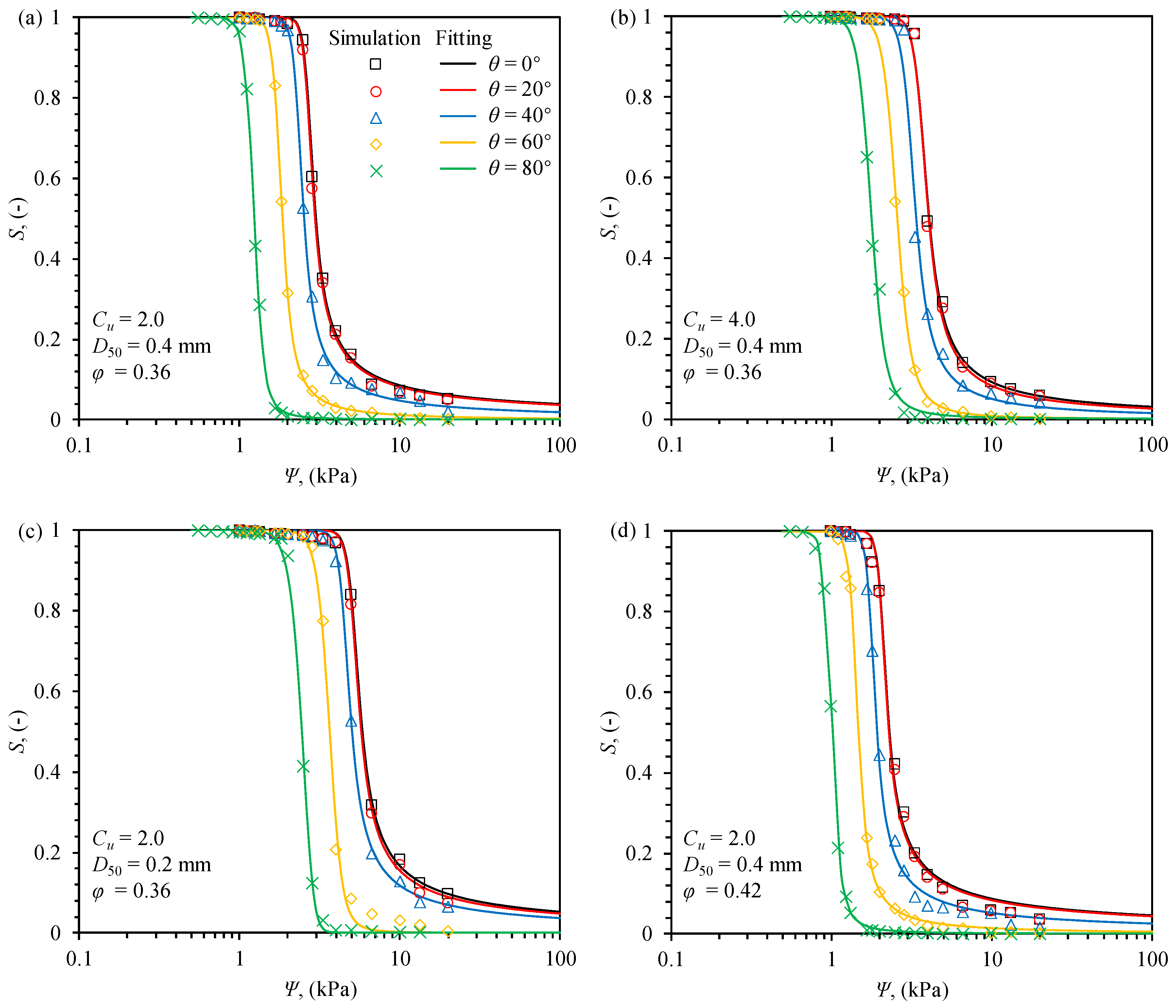 - Empirical equations developed in this study provide practical tools for estimating and based on soil properties. These equations demonstrate that the combined effects of grain size distribution, density, and contact angle must be considered to accurately predict SWCC behavior.