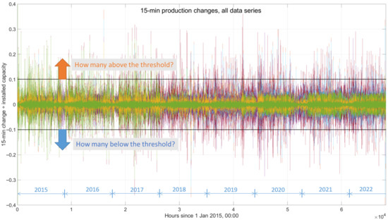 One can easily calculate the cumulative probability that the observed 15-min changes surpass a predefined threshold of of installed capacity in the positive direction or in the negative direction. Figure 1 shows examples for the thresholds of +10% and −10%, where counting the number of samples above 0.1 and below −0.1, respectively, and dividing these by the total number of samples gives the one-sided probabilities at those levels. Interestingly, the two probabilities are unequal, meaning the distribution density is asymmetric around zero. By calculating these probabilities for varying and values, one can determine the range within which the 15-min normalized changes will likely fall, with a “reasonably low” probability p of exceeding these limits. This range is then called the “confidence interval,” representing a one-sided probability confidence level of p (or a two-sided confidence level of ).