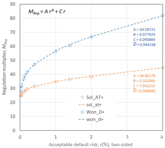 Figure 3 provides an example of an function derived from the datasets Won_D and Sol_AT, using the positive branch of the probability distributions in both cases. The fit is excellent for small acceptable risk values, which is the practical regime for FRR (Frequency Restoration Reserve) dimensioning. As mentioned earlier, the negative branches would yield slightly higher values, which is not significant for this research but could be relevant in future, more detailed studies. It is obvious that the data analyzed here fit very well with the regression model developed in [5] from the American data. Moreover, it looks like the regulation multipliers derived from the solar production data of short-term changes fit the same type of model, just as well as wind.