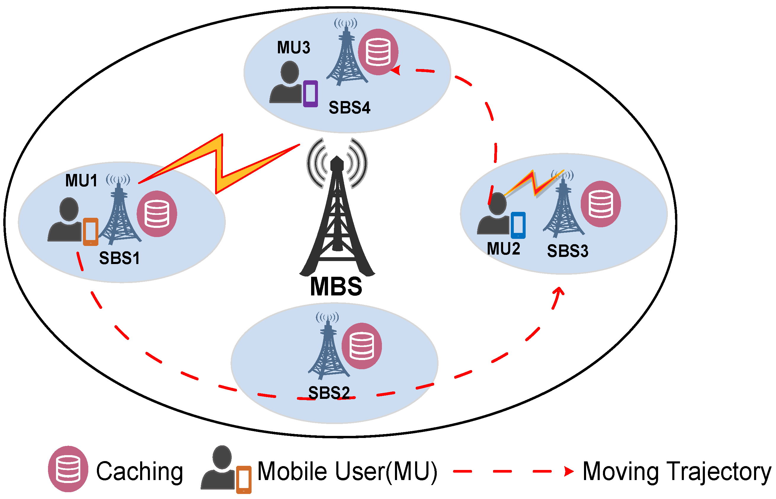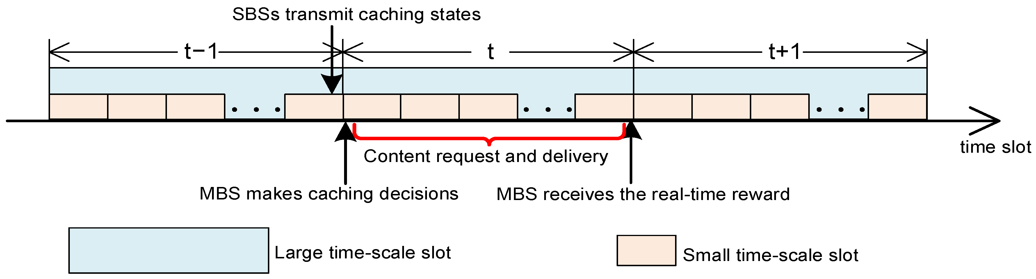 - Most Popular Caching (MPC) Algorithm [33]: At the start of each large time-scale slot, the macro base station makes caching decisions based on the historical popularity of the content. That is, each SBS n caches contents in descending order of the content popularity until the caching capacity of bits is reached.