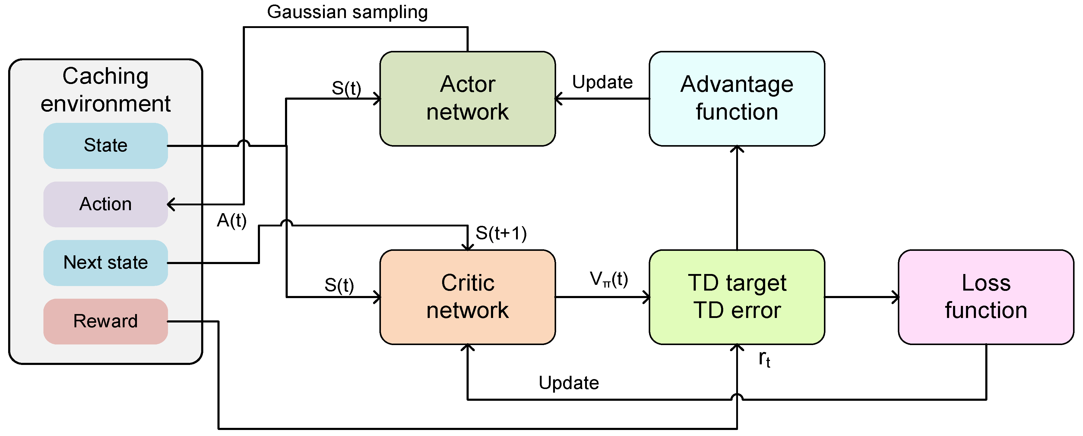 - We model the coded caching optimization problem as a Markov decision process and design an A2C-based coded caching algorithm with a caching capacity constraint. By incorporating an advantage function, the proposed algorithm reduces variance in gradient estimation and accelerates convergence, which ensures more efficient caching decisions.
