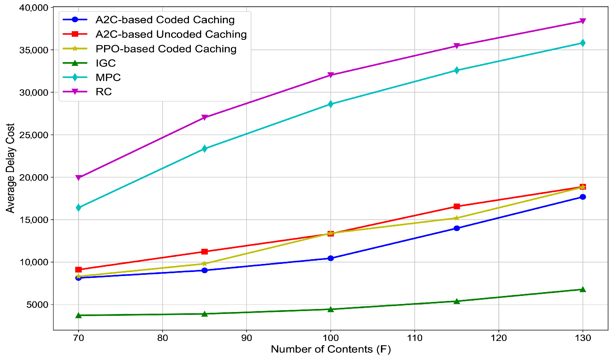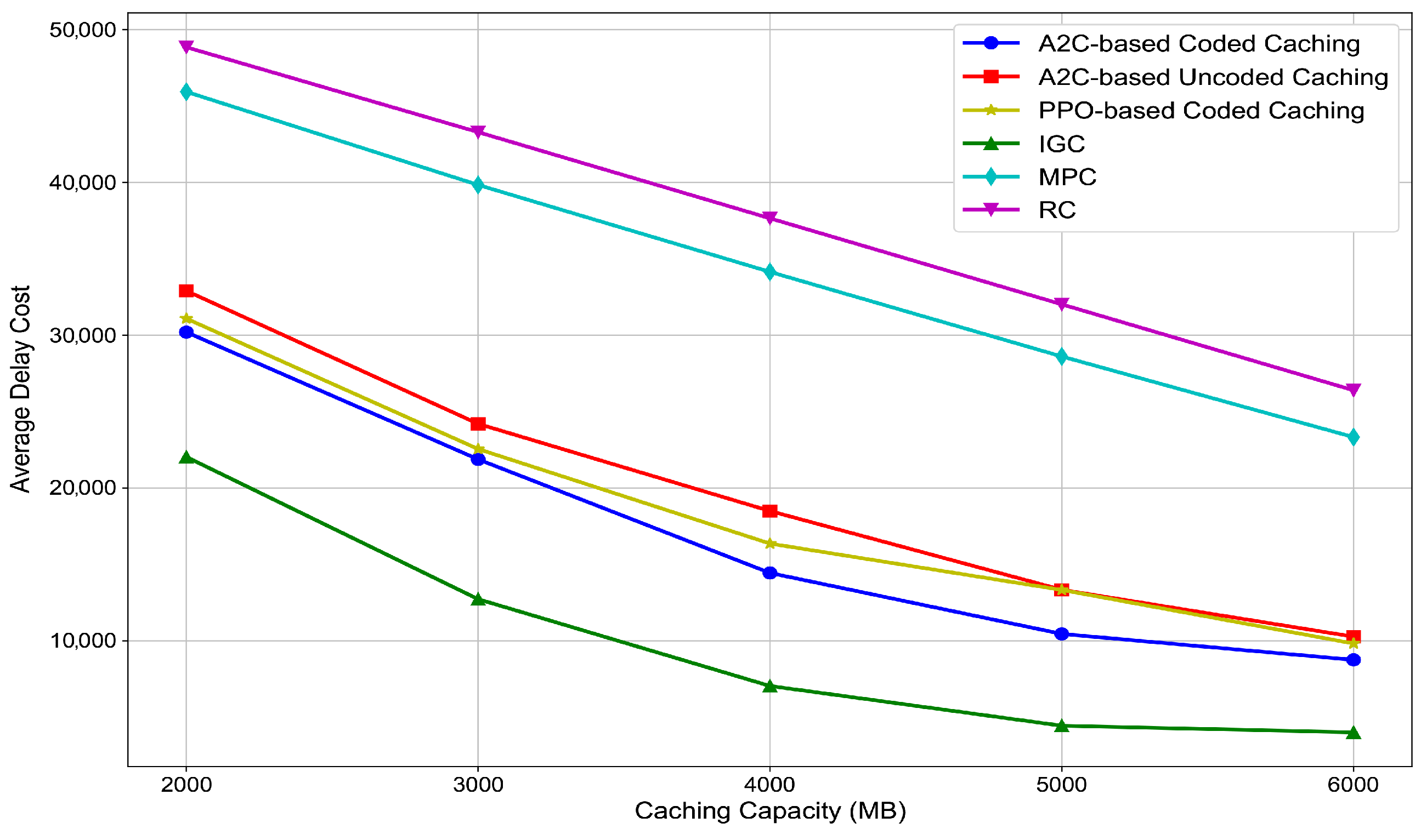 - Through extensive simulations, we evaluate the convergence of the proposed A2C-based caching algorithm and compare its performance with several benchmark caching schemes. The results demonstrate that our algorithm significantly outperforms baseline caching schemes.