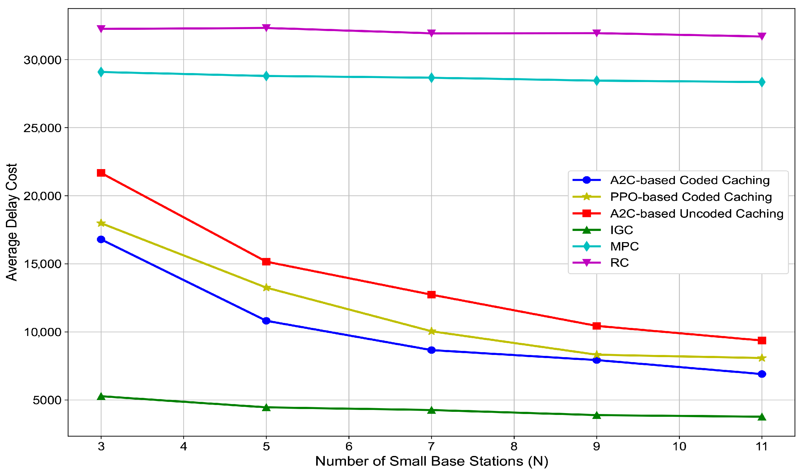 - Proximal Policy Optimization (PPO)-based Coded Caching Algorithm: This caching algorithm is based on an actor–critic model and utilizes the exact same problem formulation as our proposed method. The key difference is that PPO trains its actor network using a clipped surrogate objective function to optimize the caching policy.