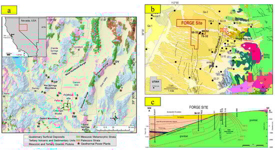 Geological map and cross section for the Utah FORGE site based on the compilation of new field observations and well data: (a) Regional geologic map of the Carson Sink Region, showing the location of the FORGE site, (b) geological map, and (c) cross section for the FORGE Utah site.