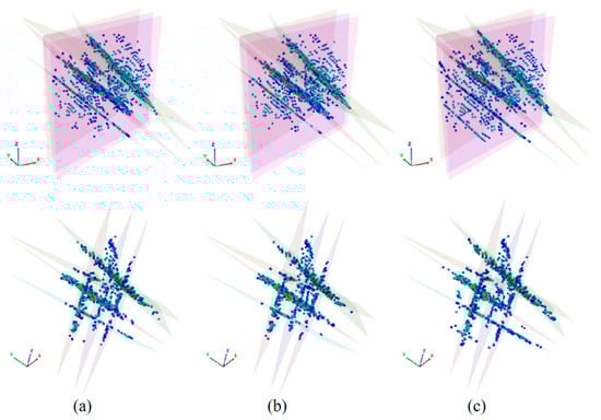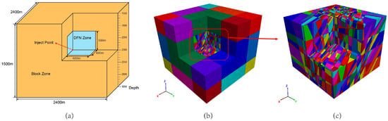 Based on the results of on-site fracture investigation and fracture statistical model, an initial DFN model was first established using Itasca 3DEC (Figure 3a). The fracture orientation follows the Fisher distribution, and the angle is randomly generated according to statistical rules; The radius distribution of the fracture conforms to the Log normal distribution, and the upper limit of the generated fracture is controlled to be the density of the three sets of fracture; In the initial DFN model, approximately 1.2 × 107 fractures were created. Obviously, fractures of this order of magnitude are too numerous to build a discrete fracture media model. Therefore, the DFN model was simplified. The detailed simplification process is described in detail in Hu et al. [], and this DFN has been compared with field measured data and is feasible. This simplification operation mainly includes the analysis of fracture connectivity, removed independent fractures that are not connected to others (Figure 3b). In addition, the merging and removal of fractures with similar occurrences to ensure the feasibility of the numerical simulation calculations (Figure 3c) [].
