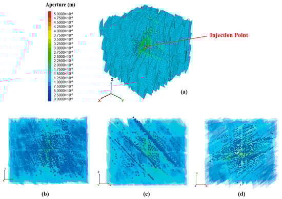 Relationship between microseismic events and fracture aperture after continuous injection for 10 h. (a) Three-dimensional distribution of microseismic events, (b) 2D section in the Y-Z direction, (c) 2D section in the X-Z direction, and (d) 2D section in the X-Y direction.