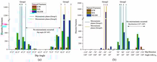The distributions of the dip angles and direction of all fractures in DFN and the positions of 7 planes are shown in Figure 9. It can be found that no microseismic event occurred in the dense fracture group with a dip angle of 70–80° and a dip angle of 140–160° in the DFN. Alternatively, the relatively low-density fracture group with a dip angle of 45–50° concentrated all microseismic events in the first group. This implies that the concentration of microseismic events does not completely depend on the density of fractures, which is mainly affected by the occurrence of natural fractures.