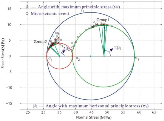 Considering that both the stratum and fractures are in a three-dimensional (3D) stress state, the 3D Mohr circle was applied to further analyze the relationship between the stress on the fractures and the induced microseisms (Figure 10). The 3D Mohr circle is used to analyze the spatial stress state under three-dimensional stress conditions, and can be combined with the Mohr-Coulomb criterion to analyze whether materials will fail under the current stress state (the combination of normal stress and shear stress on the fracture surface). If the stress state is close to the boundary of three circles at a point in the diagram, then this point tends to fail. The stress analysis diagram shows that the fractures that induce microseismic accumulation can be roughly divided into two groups: the fractures at an angle of 45° to the direction of the maximum principal stress (σ1) (Group 1); the other is the group of the fractures with an angle close to 60° with the maximum horizontal principal stress (σ2) (Group 2). These results are consistent with the analysis of the microseismic plane by planarization (Figure 8).