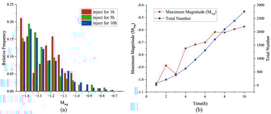 Results of microseismic magnitude: (a) Magnitude frequency distribution histogram and (b) maximum magnitude statistical results of microseismic events after fracturing for 1 h, 5 h and 10 h.