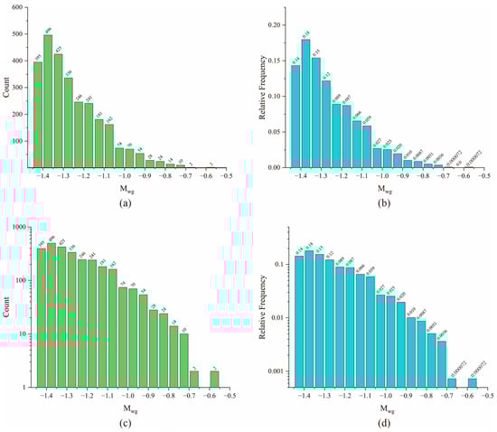According to Das et al. [], microseismic magnitudes can be calculated based on seismic moment (Equation (9)). Compared with the commonly used moment magnitude (Mw), magnitudes obtained by this method provide more accurate results for the analysis of very small-magnitude earthquakes.