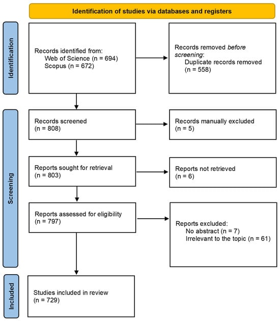 The Preferred Reporting Items for Systematic Reviews and Meta-Analyses (PRISMA) guidelines were followed []. The selection process of the papers included in this review is illustrated in Figure 1. A total of 672 publications was retrieved from Scopus and 694 from Web of Science, accounting for 1366 publications. Duplicates (558) were then removed and the titles and abstracts of the remaining 808 papers were checked in order to select those studies that fitted the following inclusion criteria: studies published in English and articles whose title and/or abstract referred to the specific topic. The following exclusion criteria were adopted; articles without abstract, non-scientific articles, non-published materials, and letters to editors were excluded. After this manually performed screening, 5 bibliographic sources were excluded, and 6 full papers were not retrieved. The remaining 797 full-text records were deeply inspected. A total of 61 articles were excluded because they were irrelevant to the topic, and another 7 were excluded because they had no abstracts. Finally, 729 papers were included in this systematic review (Figure 1).