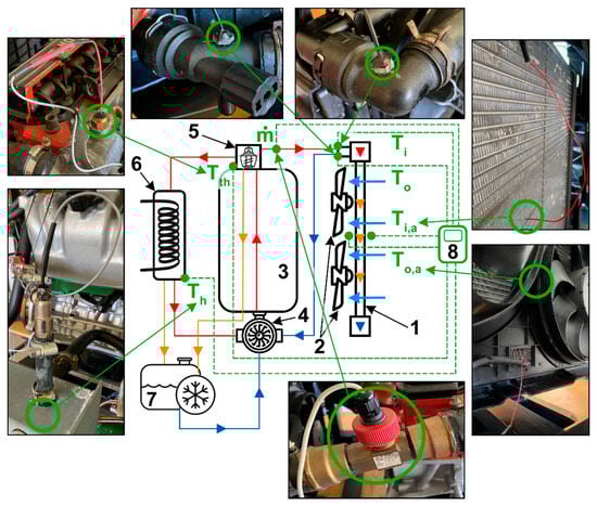 Laboratory experimental setup of a car engine cooling circuit. 1—engine cooler, 2—cooler fan, 3—car engine, 4—water pump, 5—thermostat, 6—heater, 7—expansion tank, 8—data logger, ṁ—coolant mass flow rate sensor, Ti—temperature sensor in the cooler inlet pipe (coolant inlet temperature), To—temperature sensor in the cooler outlet pipe (coolant outlet temperature), Ti,a—temperature sensor located in front of the cooler (inlet air temperature), To,a—temperature sensor located behind the cooler (outlet air temperature), Th—temperature sensor located in the heater, Tth—temperature sensor located in the thermostat.