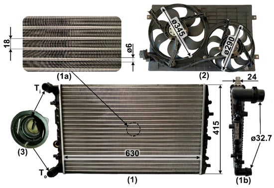 Experimentally investigated a fin-and-tube cooler with a pair of fans. (1) Basic dimensions of the cooler in mm, (1a) outer diameter of the tubes and spacing between the tubes, (1b) width of the cooler and diameter of the inlet and outlet pipes, (2) fan blade diameters, and (3) fitting of the coolant temperature sensors at the inlet and outlet pipes of the cooler.