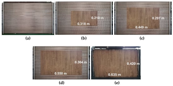 A layer of silty soil mixed with water, 2 mm thick, was applied to the front external heat exchange surface of the cooler, gradually covering 25%, 50%, 75%, and 100% of the surface (Figure 3). Proportional dimensions were calculated for individual percentage clogging of the cooler based on the width and height dimensions of the clean cooler, 0.635 m and 0.420 m, respectively. The cooler was clogged from the central axis towards the sides.