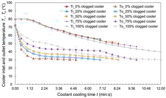 The temperatures of the coolant at the inlet and outlet of the cooler when varying the percentage of fouling of the cooler’s external surface during the cooling process are shown in Figure 4. The cooling by two fans always started when the inlet temperature of the cooler reached approximately 80 °C, and the cooling was finished when the outlet temperature of the cooler reached 30 °C. As the percentage of cooler clogging increased, the cooling time also increased from 7 min for 0% cooler clogging to 12 min for 100% cooler clogging. The larger the external surface area of the cooler covered with silty soil, the lower the heat dissipation from the cooler to the surroundings, and thus the cooling time increases.
