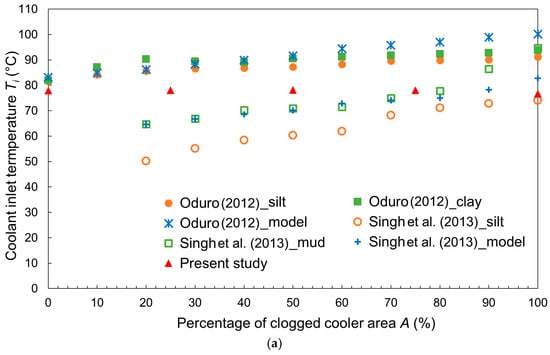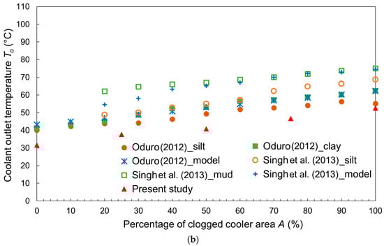 Comparison of the present study to the authors’ study of the effect of silt, clay, and mud on the inlet and outlet temperatures of the coolant. (a) variation in coolant inlet temperature with percentage clogging of the external cooler area [,], (b) variation in coolant outlet temperature with percentage clogging of the external cooler area [,].
