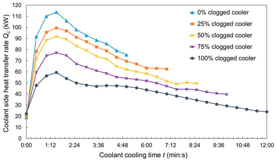 The influence of the percentage clogging of the cooler’s external heat exchange surface is also evident from the heat transfer rate values on the coolant side, Qc (Figure 6). The Qc values were calculated according to Equation (1). In all combinations examined, the maximum heat transfer rate was achieved when the coolant was cooled for 1 min and 30 s. Until this time, the Qc values increased, and from 1:30, they decreased gradually until the cooler outlet temperature reached 30 °C. The unclogged cooler reached a maximum heat transfer rate of 113.69 kW, while the 100% clogged cooler reached only 59.52 kW at the same time. This means that the Qc value of the fully clogged cooler has decreased by 1.9 times.