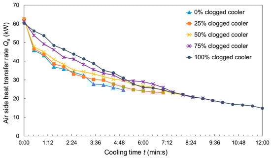 The higher surface temperatures subsequently also affected the heat transfer rate on the air side, Qa (Figure 8). The Qa values were calculated according to Equation (2). The maximum values of Qa were achieved at the start of cooling in the range of 62.83 kW to 60.27 kW for the unclogged to gradually completely clogged cooler. With the increase in cooling time, the heat transfer rate on the air side decreased to values ranging from 24.68 kW to 14.85 kW for the unclogged to gradually completely clogged cooler. It can be concluded that the Qa value of the fully clogged cooler decreased by 1.0 to 1.7 times from the start to the end of cooling compared to the unclogged cooler.