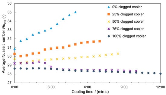 Based on the average heat transfer coefficient values, the average Nusselt number values (Figure 10) were calculated according to Equation (4). The increase and decrease in Nuavg values are shown in Table 3, and the increase in Nuavg with cooling time was achieved only for 0%, 25%, and 50% cooler clogging. On the contrary, 75% and 100% cooler clogging showed a decrease in Nuavg during the cooling process. It indicates that the higher percentage of silt clogging the cooler causes a decrease in heat dissipation from the cooler to the surroundings, even with two cooling fans on the cooler. This can lead to damage to engine components during long-term operation of the vehicle.