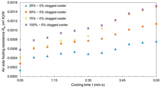 The fouling resistance on the air side Rfa values during the cooling process, calculated from Equation (6), are shown in Figure 12. For the comparison of values in the same cooling time range, the Rfa values are presented for the first 5 min of cooling. As the percentage of the cooler’s external heat exchange surface fouled by silty soil increased, the Rfa values also increased. The highest Rfa values in the range of 0.58 × 10−3 to 1.52 × 10−3 (m2·K)/W were achieved by the 100% clogged cooler versus the 0% clogged cooler. The cooler clogged at 25%, 50%, and 75%, acquiring values in the range of 0.14 × 10−3 to 0.76 (m2·K)/W, 0.28 × 10−3 to 1.14 (m2·K)/W, and 0.42 × 10−3 to 1.50 (m2·K)/W, respectively. Simultaneously, with an increase in cooling time, the Rfa values increased during five minutes of cooling. The higher percentage difference between the clogged and unclogged cooler surface leads to higher fouling resistance on the air side. The calculated Rfa values are in agreement with values commonly achieved in dusty and off-road conditions while driving a car.